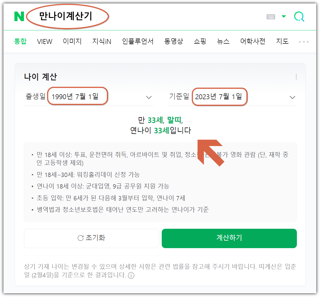 3. 네이버 만나이 계산기를 통해 나이계산을 하시면 투표, 운전면허 취득, 아르바이트, 취업 연령, 군대입영, 9급 공무원 지원 가능(연나이 18세 이상),초등 입학(만 6세가 된 다음해 3월부터 입학, 연나이 7세), 병역법과 청소년보호법은 태어난 연도만 고려하는 연 나이 기준 등 주요 나이 기준도 확인하실 수 있어요.