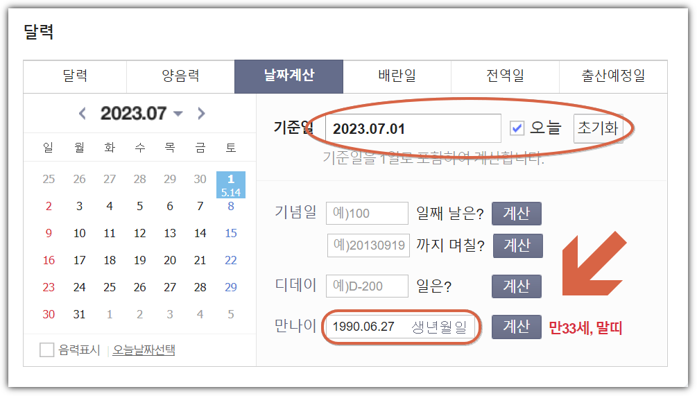 1. 카카오에서도 만 나이 계산기 서비스를 제공하고 있는데요, 검색창에 만나이 계산기라고 치시면 기준일을 입력할 수 있도록 되어 있습니다.