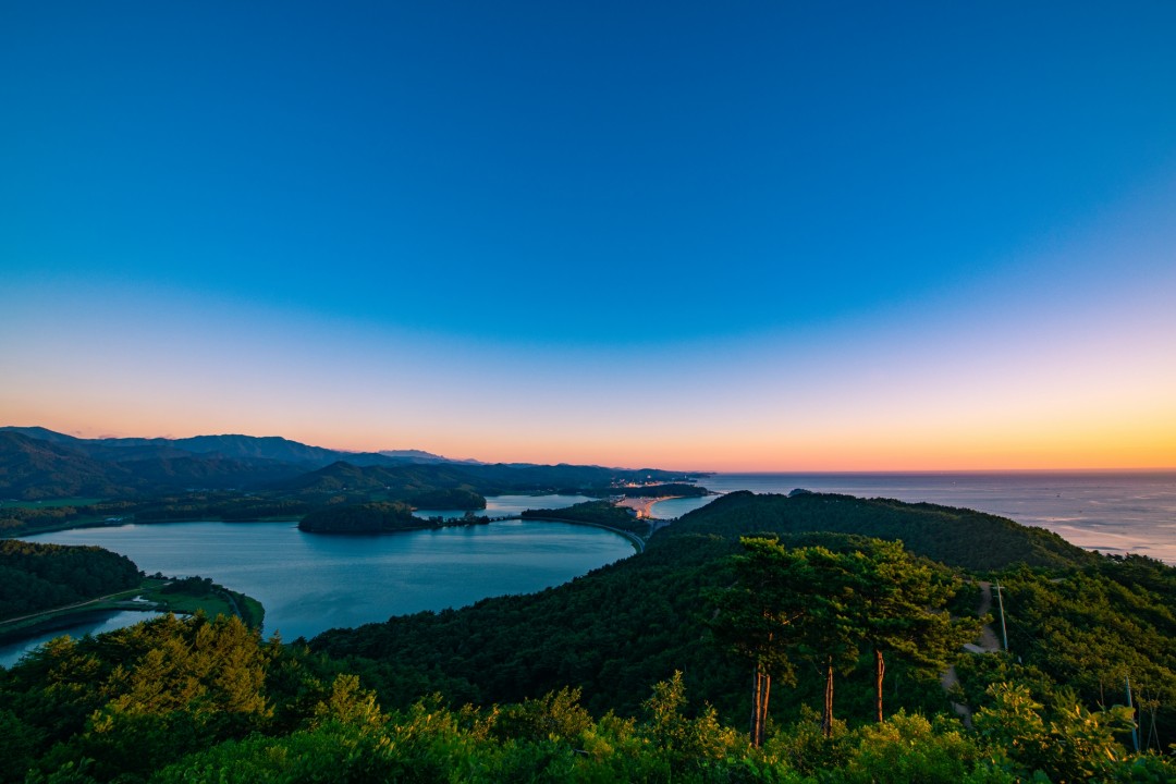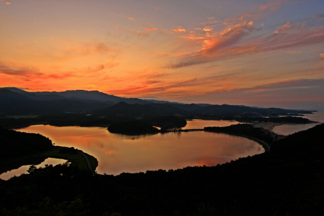 고성에서 아름답기로 소문난 낙조를 보시려면 응봉으로 가보세요. 등산로는 가파른 오르막과 내리막 한두 군데를 제외하면 대부분 완만한 코스이며 바다를 조망하는 정자와 벤치에서 중간중간 쉬어갈 수도 있습니다. 천천히 걸어도 4~50분이면 충분한 거리이구요, 해발 122m에 응봉 정상이 위치해 있어요. 응봉은 아담한 산이지만 정상석과 정자도 마련되어 있는데 일단 정상에 오르고나면 믿기지 않을 만큼 웅장한 풍경이 펼쳐집니다. 산과 바다, 호수가 한데 어우러져 감탄을 자아내는데요, 특히 서쪽으로 태양이 뉘엿뉘엿 저물며 백두대간을 황금빛으로 비추는 모습은 그야말로 장관입니다. 북쪽으로는 금강산 최고봉인 비로봉과 해금강, 아홉 신선이 바둑을 두었다는 구선봉 등 손꼽히는 절경도 볼 수 있어 고성 가볼만하곳 중 풍경으로는 최고의 명소라고 볼 수 있어요. 만약 해가 완전히 저물었다면 지름길인 임도를 따라 내려가는 것이 좋구요, 15분 남짓 걸으면 출발점인 화진포 생태박물관에 도착하니 참고하시기 바랍니다.