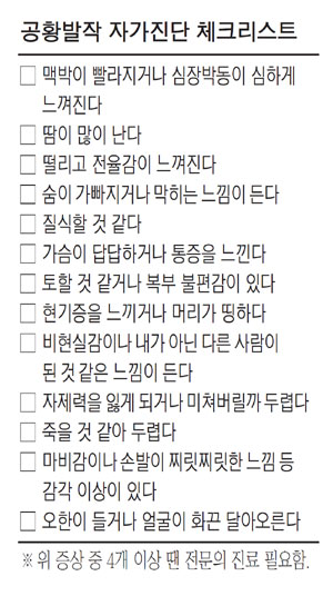 1. 가슴 두근거림, 식은땀, 몸의 떨림, 숨이 안 쉬어지거나 답답한 느낌, 질식할 것 같은 느낌