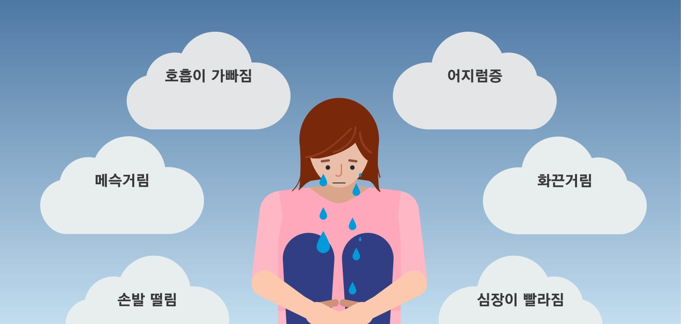 이 밖에 어지럽고 머리가 띵한 증상 등 머리와 관련된 증상도 있어요. 이러다가 결국 정신을 잃고 쓰러질 것 같다, 죽을 것 같다, 미쳐버릴 것 같다는 공포감이 들어 자신의 통제력을 상실한 느낌도 들어요. 이 중에서 어떤 증상이 더 심하냐는 사람에 따라 다릅니다.