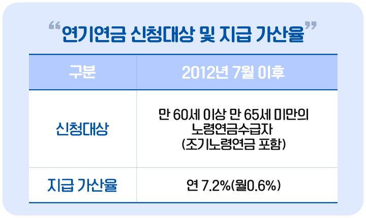 연기연금은 연금의 지급이 연기되는 매 1년당 7.2%(매월 0.6%)의 연금액을 더 올려서 받을 수 있기 때문인데요, 예를 들어 원래 월 100만 원을 지급받을 수 있는 사람이 1년 연기하면 7만 2천 원이 더해져 107만 2천 원을, 최대치인 5년을 연기한다면 36%가 증액되어서 136만원의 연금을 받을 수 있게 되는 것입니다.
