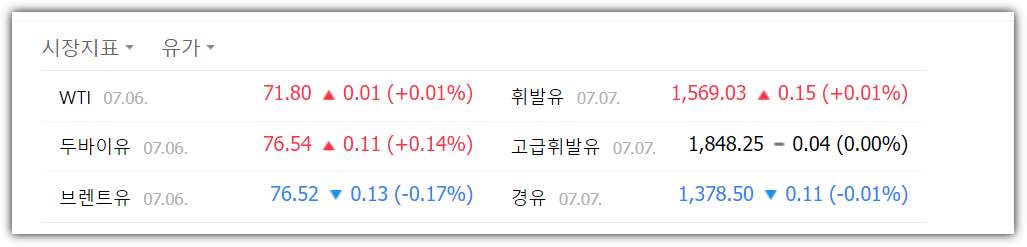 국제유가 전망 실시간 가격추이 등을 정리해보도록 하겠습니다. 지난 6일(현지시간) 뉴욕상업거래소에서 8월 인도 서부텍사스산원유(WTI) 가격이 전장보다 1센트(0.01%) 오른 배럴당 71.80달러를 기록한 바 있습니다.
