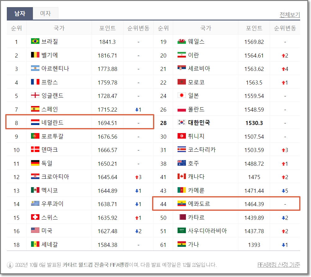 네덜란드 피파 랭킹은 8위, 에콰도르 피파랭킹은 44위입니다. 기존에 A조는 1위 가능성이 높은 네덜란드를 제외하고 2위 싸움이 치열할 것으로 예상되어 왔는데요, 현실적으로 카타르의 16강 진출 가능성이 낮은 상황이기 때문에 에콰도르 입장에선 무승부를 거두어도 좋은 상황이라고 볼 수 있습니다.