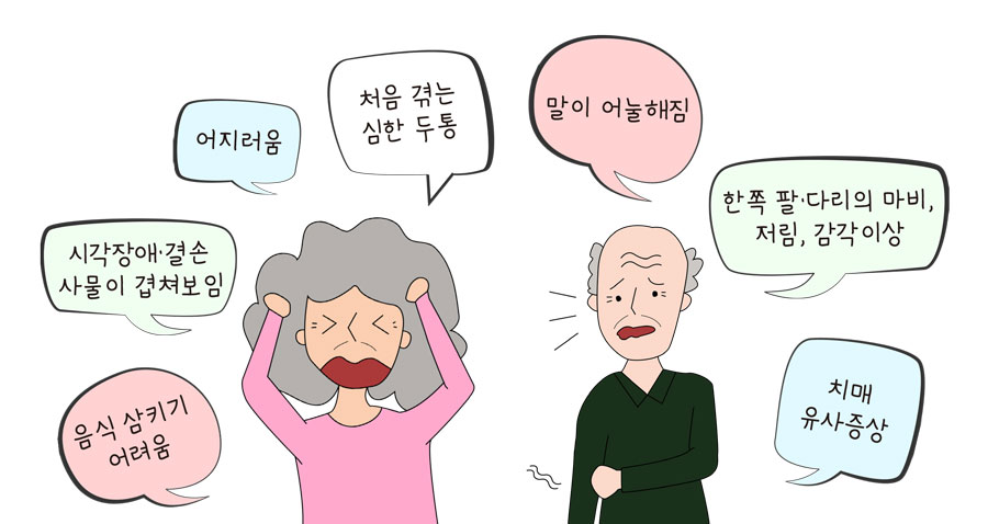 뇌졸중은 뇌세포가 사멸하면서 반신마비, 언어장애, 의식장애 등과 같은 심각한 후유증을 유발할 수 있으므로 가능한 한 빠르게 조치하는 것이 중요합니다. 뇌경색일 경우 일반적으로 6시간 이내에 혈전을 제거하면 상태를 호전시킬 수 있기 때문에 뇌졸중 전조증상이 있을 시 지체하지 말고 가족이 병원으로 데리고 가시기를 당부드립니다.
