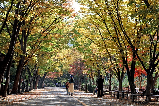 서울대공원 내 코끼리열차 순환도로변 2.2km 둘레길이 단풍 명소입니다. 느티나무와 벚나무가 일렬로 식재되어 있어 풍경이 좋습니다.