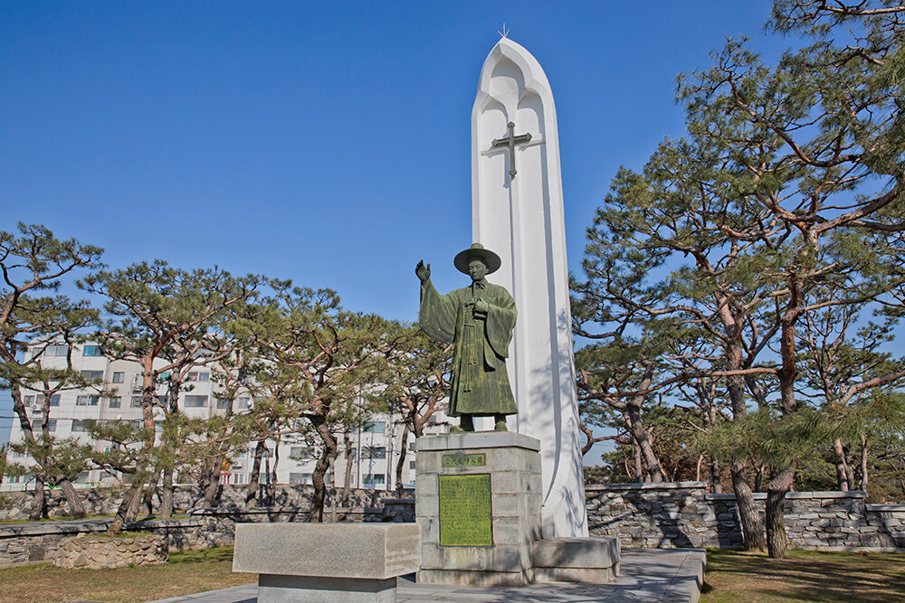 솔뫼는 '소나무가 우거진 작은 동산'이라는 뜻으로 충청도에서 제일 좋은땅 "내포" 한가운데 자리잡고 있습니다. 송산리의 자연부락인 솔뫼마을은 한국 최초의 사제 김대건 신부가 태어난 곳으로 유명한데요, 김 신부뿐만 아니라 증조할아버지 김진후, 작은할아버지 김종한, 아버지 김제준 등 4대에 걸친 순교자가 살았던 것으로 전해지고 있어요. 단아한 생가 한옥 마루에는 26세 나이에 순교한 김대건 신부 초상이 걸렸고, 맞은편 마당에 프란치스코 교황 조각상이 긴 세월의 간극을 두고 마주하고 있습니다. 생가 뒤쪽의 노송이 빼곡한 숲에는 1977년 건립한 김대건 신부 동상이 있으며 동상 뒤로 성모를 의미하는 흰색 기념탑이 우뚝솟아 있어 신비롭게 조화를 이루고 있는 모습입니다.