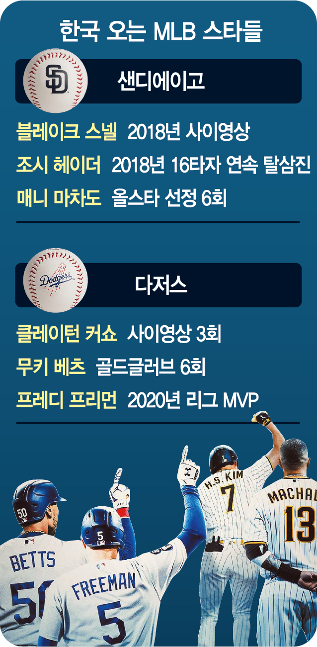 이유야 어찌되었건 중계로만 보던 MLB 선수들을 직접 볼 수 있으니, 국내 야구팬들의 가슴도 뛸 겁니다. 게다가 박찬호, 최희섭, 서재응, 류현진이 몸담았었던 ‘국민 MLB팀’ 다저스와 코리안 메이저리거 세대 교체를 이루고 있는 김하성의 파드리스 팀. 둘간의 대결 구도도 관전 포인트입니다.