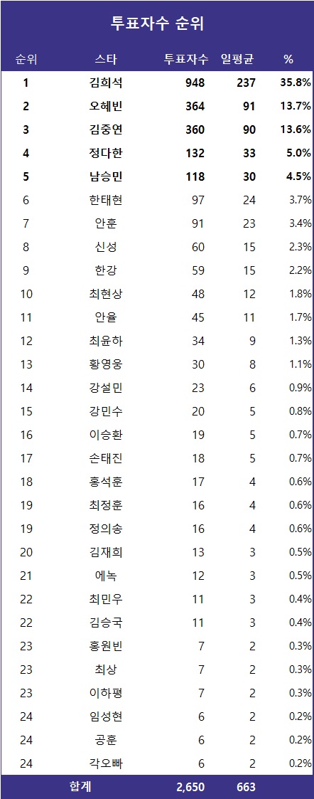 해당 순위가 실제 방송 결과에 어떻게 반영될지는 미지수이며 방송 과정에서 충분히 달라질 수 있으니 참고만 하시면 좋을 것 같습니다.