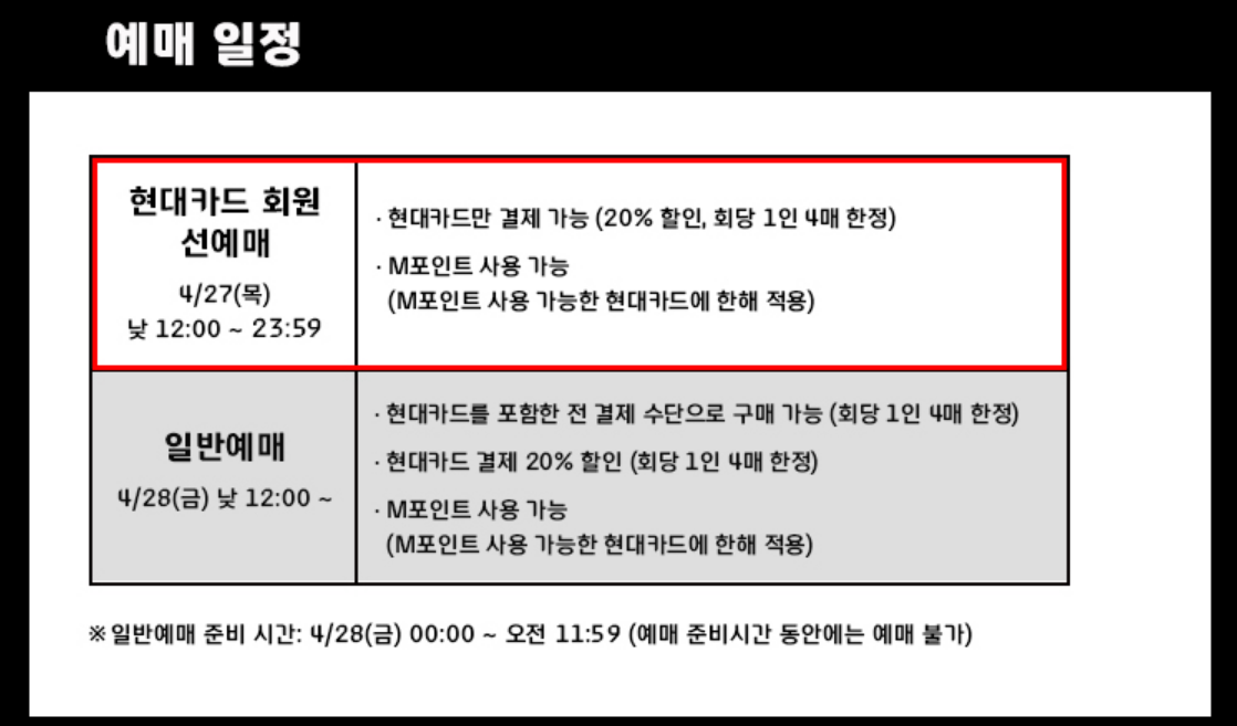 - 현대카드 회원 선예매: 2023년 4월 27일(목) 낮 12시 ~ 23시 59분