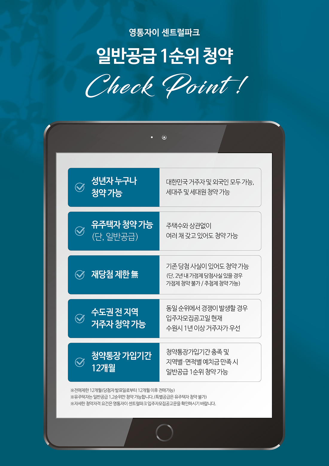 또한, 재당첨 제한을 적용받지 않고, 기존 주택당첨 여부와 관계없이 영통자이 센트럴파크 청약이 가능합니다. 단, 본 제도는 당첨된 청약통장의 재사용을 허용하는 제도가 아니며, 당첨통장은 계약여부에 상관없이 재사용 불가하니 주의하시기 바랍니다.