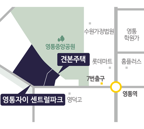 홈플러스, 롯데마트 등 대형마트가 가까이에 있어서 생필품이나 장보기도 편리한 편이며 바로 옆에 있는 영통중앙공원, 영흥숲공원 등 영통자이 센트럴파크 단지 주변에 공원환경이 잘 되어 있습니다. 수영, 골프 등 다양한 운동을 즐길 수 있는 수원체육문화센터와도 인접합니다.