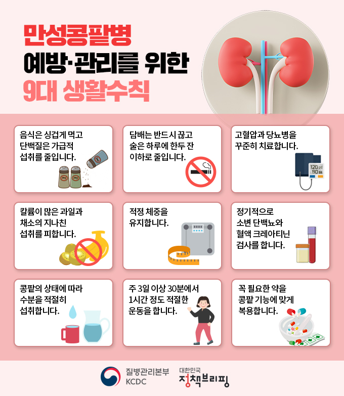 콩팥은 한 번 손상되면 회복할 수 없습니다. 따라서 평상시에 만성 콩팥병을 예방하는 데 도움되는 생활습관을 유지할 수 있게 음식은 될 수 있도록 싱겁게 먹고 사구체로 향하는 압력을 높일 수 있는 단백질도 가급적 적게 먹는 것이 좋습니다.