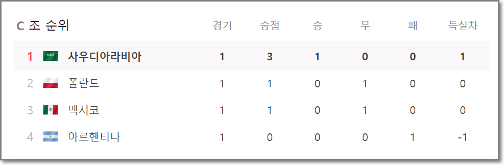 만약 아르헨티나가 이번 2차전에서 멕시코에도 패하면 다른 경기 결과와 관계없이 조별리그 탈락이 확정되는 것이고 사우디의 폴란드전 승리 결과가 나오면 최종전 결과와 상관없이 무승부도 위험해질 수 있습니다.