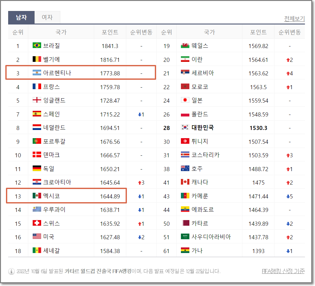 먼저 아르헨티나 피파랭킹은 3위로, 이번 대회 강력한 우승후보로 꼽혀온 팀이고, 멕시코 피파랭킹은 현재 12위로 높은 편이긴 하지만 두 팀 모두 현재 분위기가 좋지 않은 편이라 피파랭킹 순위만으로는 예측이 힘든 상황입니다.