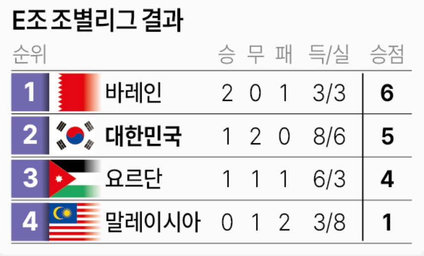 ● E조 대한민국, 말레이시아, 요르단, 바레인