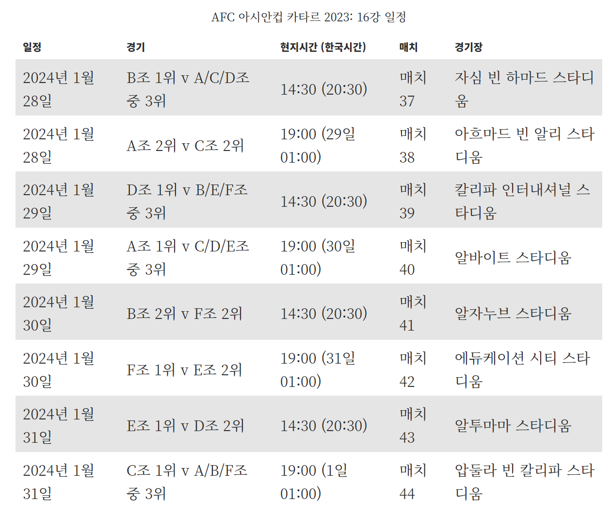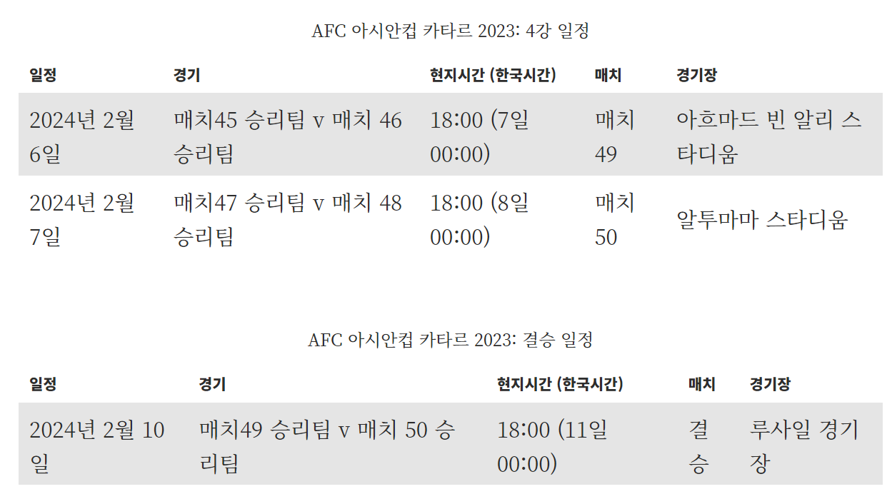 | 4강 대진표 일정 아시안컵 축구 중계방송 준결승 한국 요르단 역대전적 (0) | 2024.02.03 |