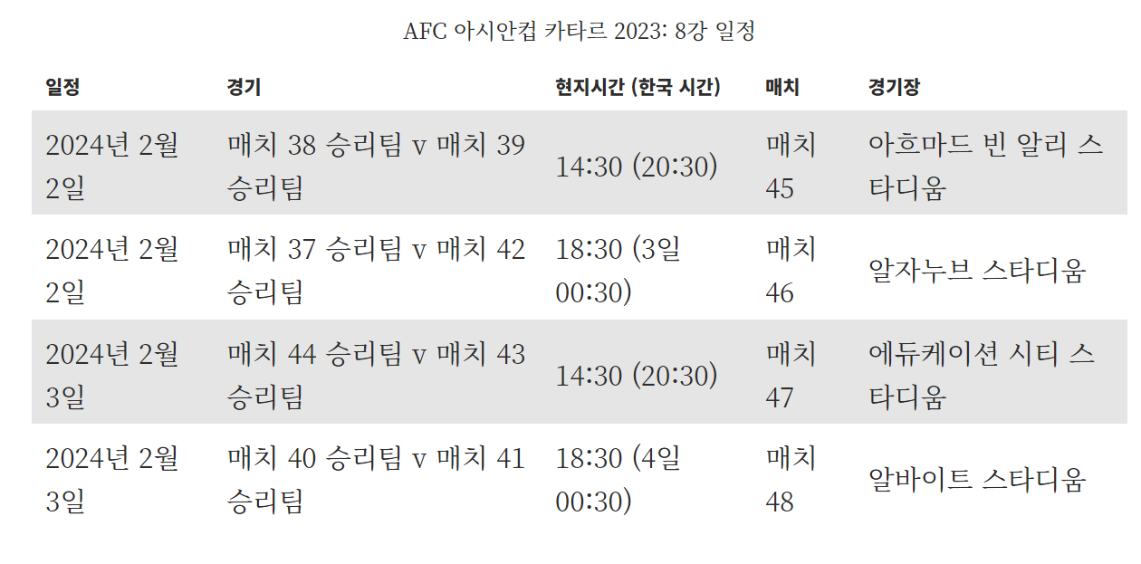 다음 경기는 1월 29일 오후 8시30분 카타르 알라이얀의 칼리파 인터내셔널 스타디움서 펼쳐집니다. D조 1위 이라크와 E조 3위인 요르단이 붙게 되며 30일 오전 1시엔 개최국이자 A조 1위인 카타르와 C조 3위 팔레스타인이 카타르 알코르의 알바이트 스타디움서 8강 티켓을 놓고 싸웁니다.