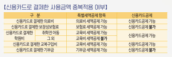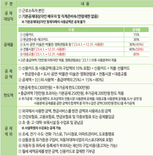- 총소득의 25%를 초과하는 신용카드 비용은 한도 내에서 공제할 수 있습니다.