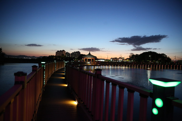 원주 시내에 있는 공원중에 가장 크고 좋은 공원으로 알려진 행구수변공원은 앞으로 큰 호수가 있고, 뒤로는 산이 보여서 경치가 좋기로 유명한 곳이예요. 또한 호수 주변으로 산책로도 잘 되어 있구요, 호수 가운데 분수도 있어 보기만 해도 시원해지는 기분을 느낄 수 있습니다. 특히 밤에는 조명이 멋있게 켜져 완전히 다른 분위기로 바뀌고 식수대와 다양한 휴식공간이 있어서 산책도 하고 쉬기에 좋은 곳입니다.