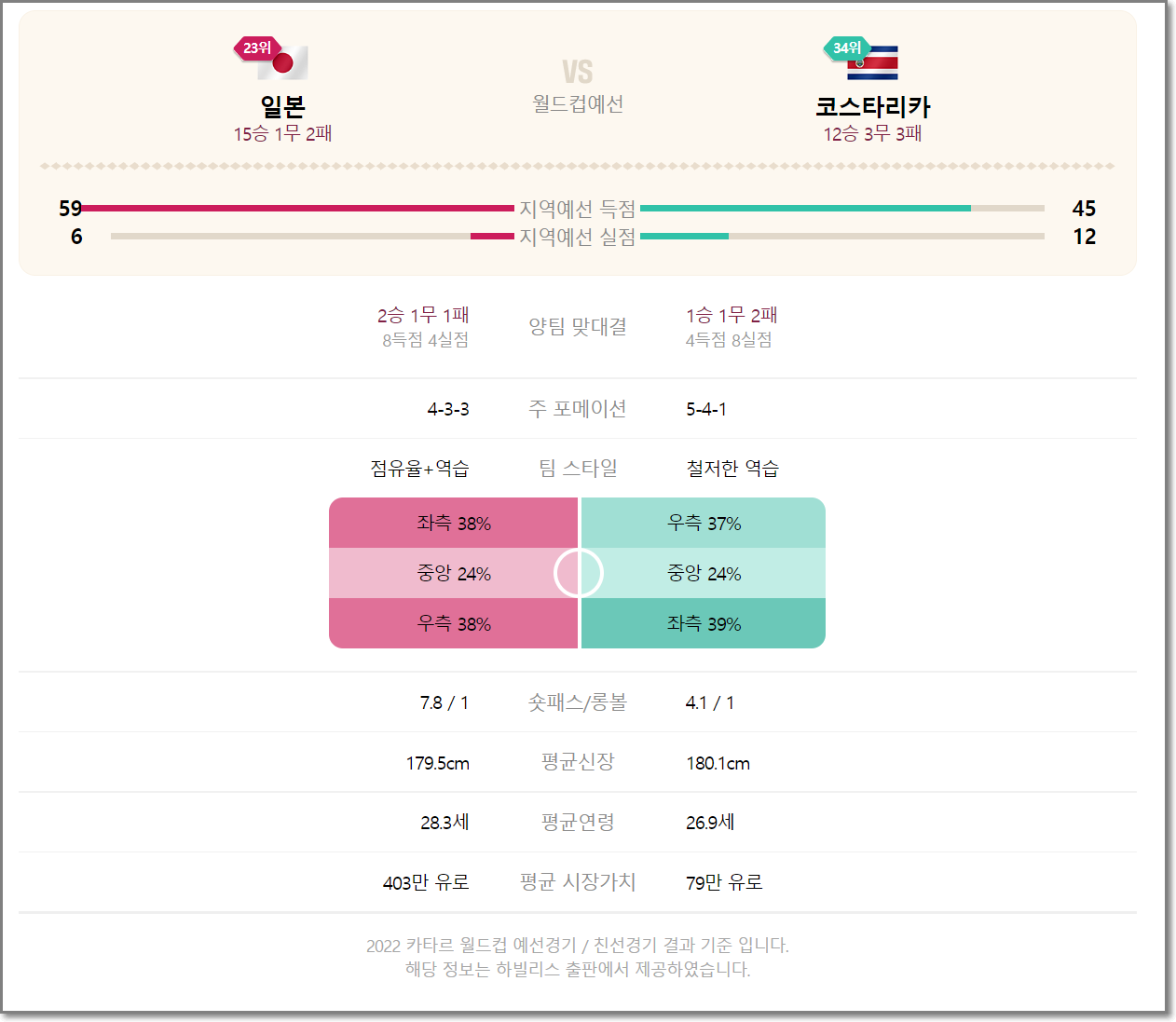 다만 일본은 이번 코스타리카 전에서 주축 선수들의 부상 공백을 메워야 한다는 문제를 안고 있는데요, 현재 수비수 사카이 히로키와 도미야스 다케히로가 햄스트링 부상으로 코스타리카전 출전이 불투명한 상황입니다. 두 선수의 빈 자리를 어떻게 채우느냐가 이번 코스타리카와의 승부에 큰 영향을 끼칠 수도 있을 것 같습니다.