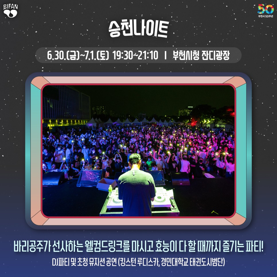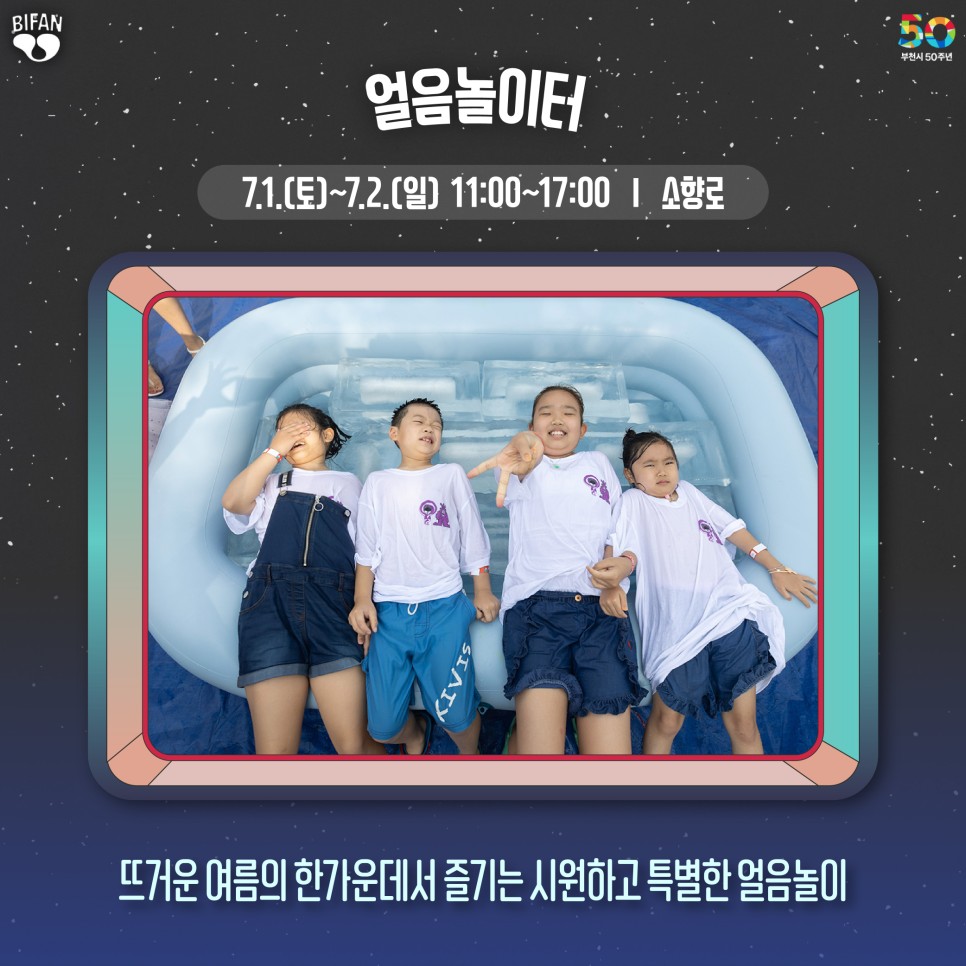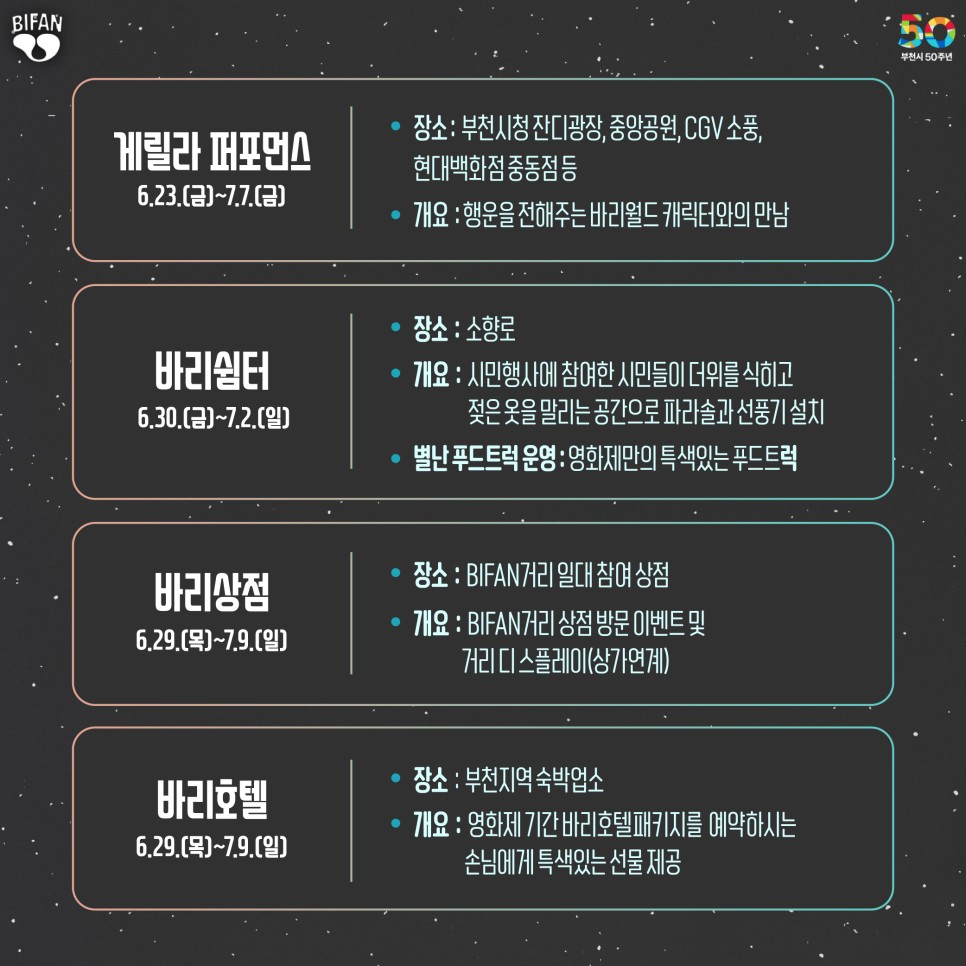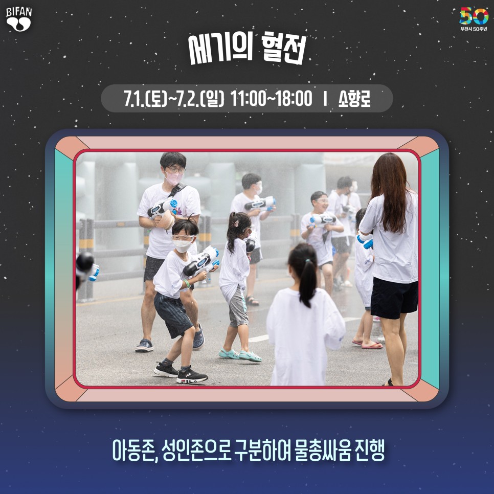 더불어 이번 영화제에서는 부천시 승격 50주년을 기념하는 다양한 프로그램도 마련되어 있다고 하는데요, ‘용쟁호투’ 등 1973년에 제작된 영화를 엄선한 ‘부천시 50주년 기념전’도 펼쳐질 예정이며 영화제 기간 ‘7월의 카니발’ 프로그램을 통해 퍼레이드, 댄스파티, 물총 싸움 등 대규모 시민 참여 행사도 열립니다.