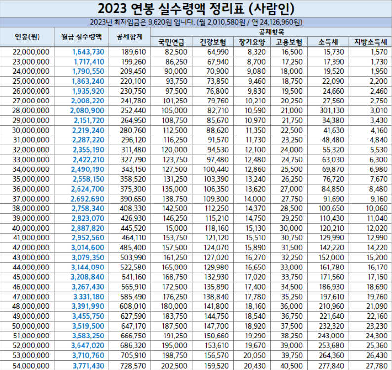 2023년 최저임금 연봉 실수령액표