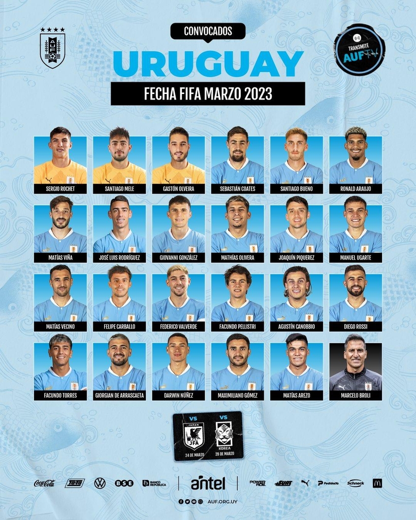 우루과이 축구 국가대표팀 명단에는 레알 마드리드의 발베르데와 리버풀의 누녜스, FC바르셀로나의 아라우호, 맨유의 펠레스트리, 나폴리의 올리베라 등 빅클럽에서 활약하는 젊은 피들이 뽑힌 것이 눈에 띕니다.