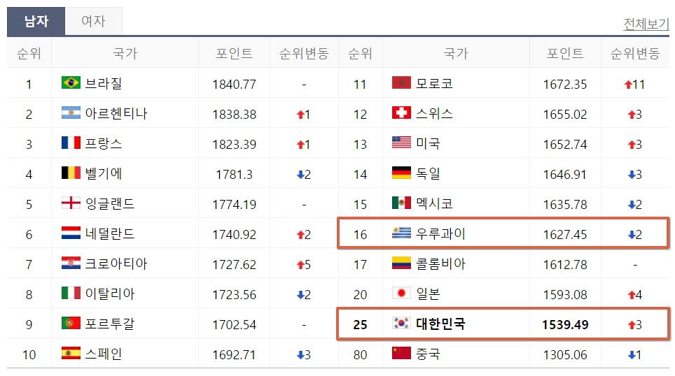 피파랭킹의 경우 지난해 12월 발표한 FIFA 랭킹에서 우루과이가 16위로 25위인 한국보다 높습니다.
