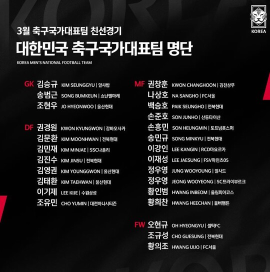 ▶FW=황의조(FC서울) 조규성(전북) 오현규(셀틱)