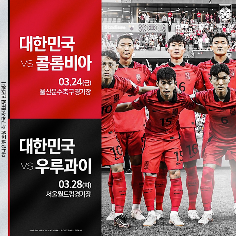 - 03/28(화) 20:00시 대한민국 VS 우루과이 (서울월드컵경기장)