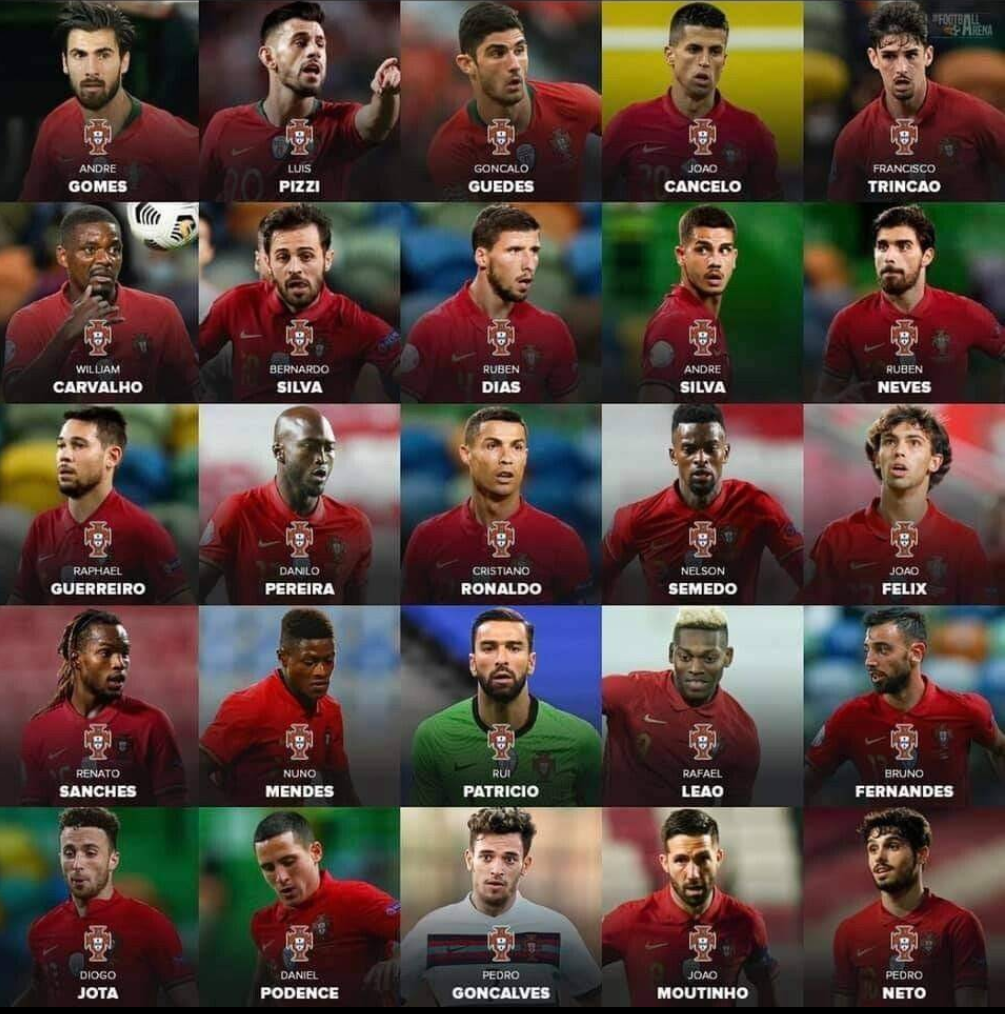 ▲ 공격수(FW) = 안드레 실바(RB라이프치히), 크리스티아누 호날두(맨체스터 유나이티드), 곤살루 라모스(벤피카), 주앙 펠릭스(아틀레티코 마드리드), 하파엘 레앙(AC밀란), 히카르두 호르타(브라가)