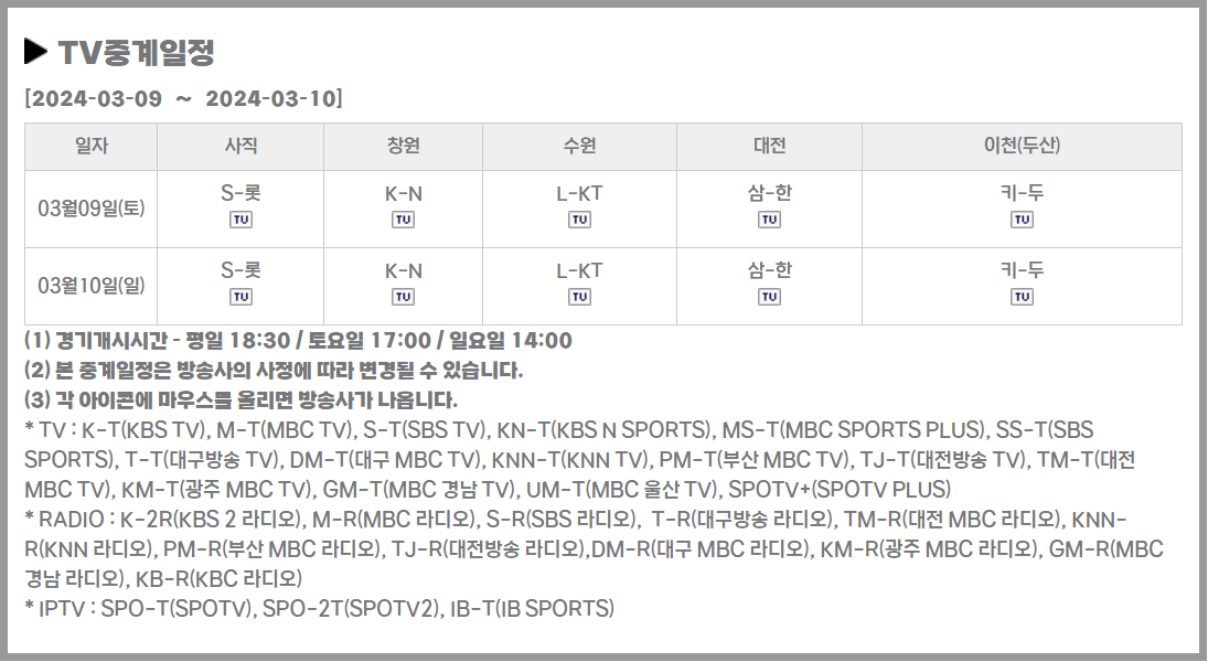 ● 포스트시즌: WC: KBS-SBS, 준PO: MBC-KBS-SBS, PO: MBC-KBS-SBS, KS: KBS-MBC-SBS 순서로 진행될 예정입니다.