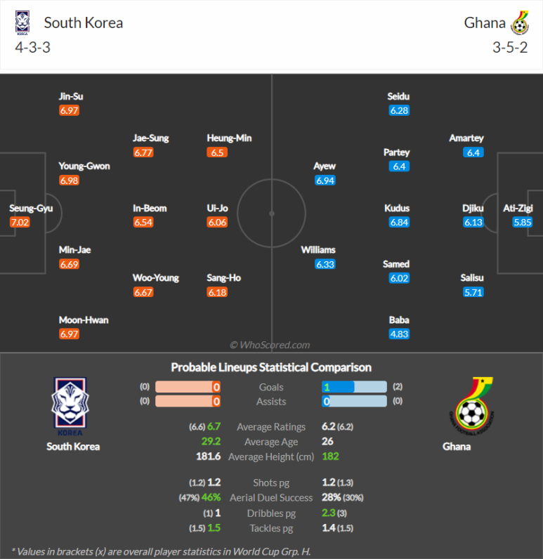 가나 축구 국가대표팀의 장점으로는 왼쪽 공격수 이냐키 윌리엄스와 왼쪽 윙백 바바 라만, 중앙 미드필더 모하메드 쿠두스 등을 앞세운 왼쪽 측면 공격이 빠르다는 점인데요, 중거리 슈팅도 자주 날렸습니다. 당시 유효 슈팅 개수는 1개 밖에 안되지만 슛 강도도 강한 편이고 블록도 당하지 않았다는 점에 주목할 필요가 있을 것 같습니다. 한국 수비가 만일 너무 내려온 위치에서 자리를 지키는 수비를 한다면 중거리 슛으로 위기를 자초할 수 있다는 지적입니다.