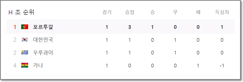 지금까지 한국 가나 경기시간 역대 전적 심판 라인업 전력 분석을 살펴봤습니다. 한국은 현재 승점 1점을 추가하여 H조 공동 2위에 자리하고 있는데요, 이제 상대는 가나입니다. 이 경기에서 승리하면 16강으로 가는 확률이 훨씬 높아진다고 볼 수 있습니다. 만약 한국이 가나를 이기고, 같은 날 포르투갈이 우루과이를 꺾으면 최종전에서 비기기만 해도 16강이 확정되기 때문입니다. 오는 28일 오후 10시 한국 가나 2022 카타르 월드컵 2차전 경기에서 한국이 꼭 승리하기를 기원합니다.