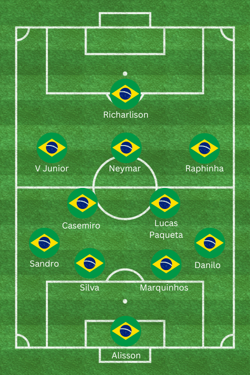브라질은 피파랭킹 1위로 자타 공인 이번 대회 우승후보 1순위 중 한 곳입니다. 브라질의 가장 강력한 무기는 초호화 공격진에서 나온다고 볼 수 있는데요, 먼저 플레이메이커 네이마르의 패스를 비롯하여 비니시우스의 날카로운 측면 침투, 최전방 히샤를리숑의 골 결정 능력까지 모두 위협적인 팀입니다. 예선 3차전 카메룬과의 경기에서도 벤치 멤버 만으로 꾸렸음에도 정상급 공격진이라는 소리가 나올 정도였습니다.
