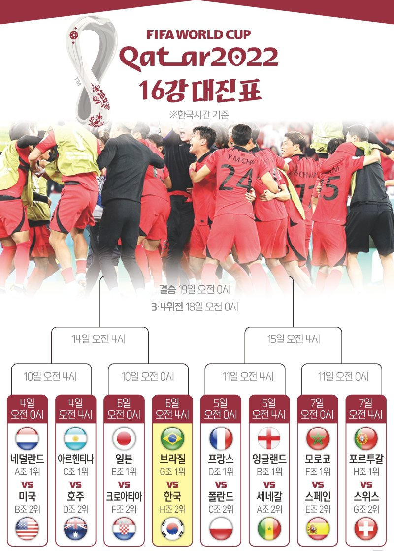 지금까지 한국 브라질 역대전적 경기시간 16강전 분석을 알아봤습니다. 이제 한국 브라질까지 2022 카타르 월드컵 16강 대진표가 완성되었습니다.