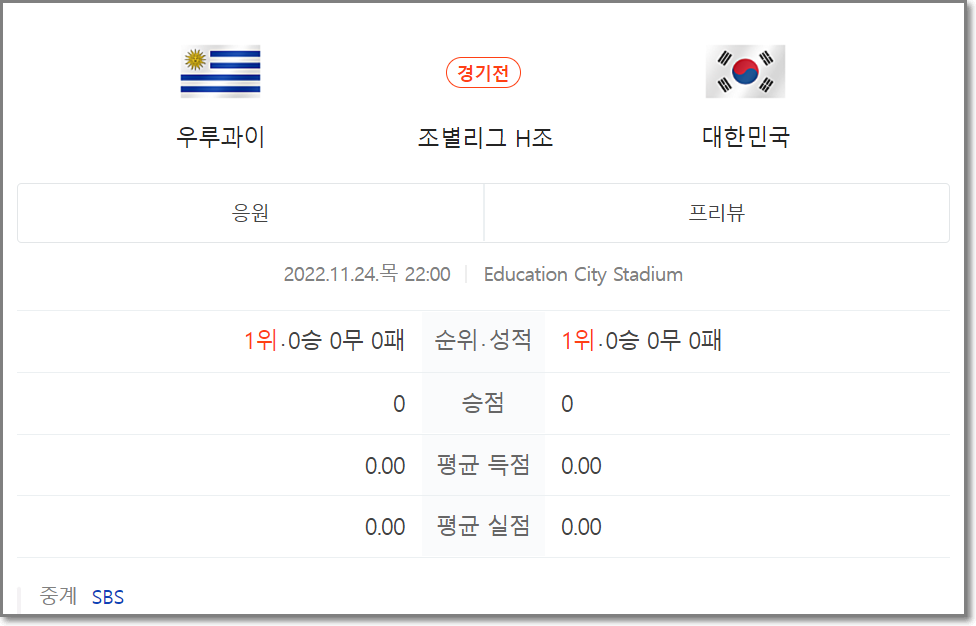 한국 우루과이 경기시간 경기장 상대전적 예상 라인업을 정리해 보도록 하겠습니다. 한국 축구 대표팀이 한국시간으로 오는 24일 밤 10시에 2022 카타르 월드컵 H조 조별리그 1차전에서 우루과이를 상대합니다.