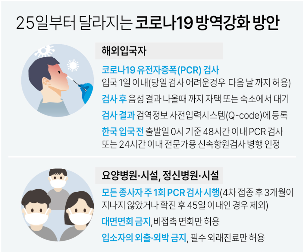 우선 정부는 지난 6월 해외입국자의 PCR 검사 시한을 입국 후 3일 이내로 조정하였으나 코로나19 재유행으로 지난 7월 25일부터 입국 1일 차에 PCR 검사를 하도록 규제를 강화한 바 있습니다.
