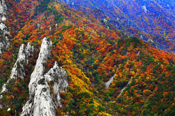 단풍하면 가장 먼저 떠오르는 명소가 바로 설악산이죠. 천의 얼굴을 가진 설악산은 계절마다 각각 다른 매력을 보여주지만 설악산의 기암괴석, 맑은 계곡 등과 어우러진 단풍의 절경이야 말로 설악산의 진정한 아름다움이라고 볼 수 있을 것 같아요.