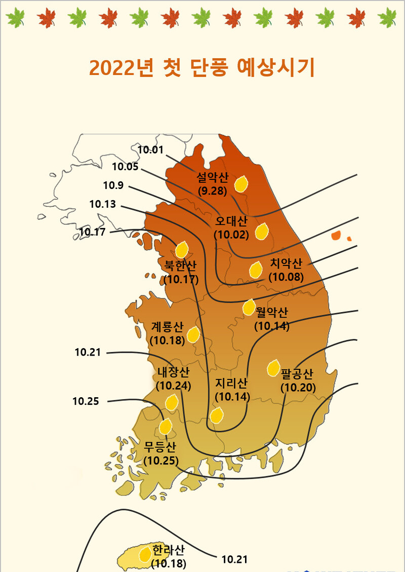 이 예측에 따르면 올해 첫 단풍은 평년과 비교했을 때 1∼5일 늦어지는 것으로 설악산의 경우 단풍 절정시기도 3∼6일 늦어지게 됩니다. 주요 단풍 명소들의 2022년 단풍시기는 다음과 같습니다.