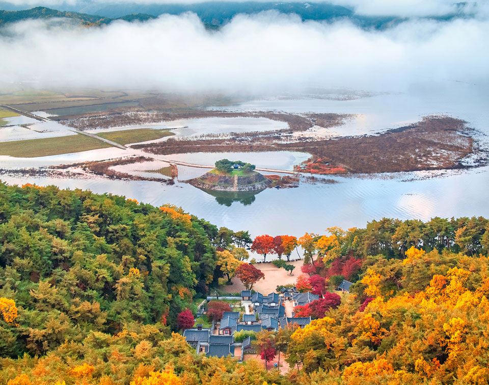 한국에서 가장 오래된 목조건물이 있는 안동 봉정사는 672년에 창건된 사찰로 주변을 둘러싸고 있는 단풍이 빨갛게 물든 풍경이 절경입니다.