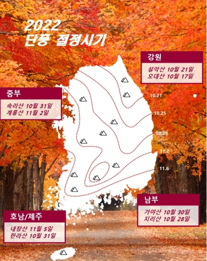 2022년 단풍 절정시기는 육안으로 보아 산 전체면적의 80% 정도 단풍으로 물들었을 때로 정하는데 제주 등 일부 지역을 제외하고 대부분 10월 하순경이라고 생각하시면 될 것 같습니다. 물론 예측이기 때문에 변동이 있을 수는 있지만 단풍 절정 시기는 첫 단풍 이후 약 2주 후라고 하네요.