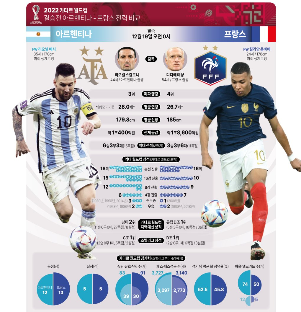 현재 다수의 전문가들이 내놓고 있는 아르헨티나 프랑스 전력 예상도 거의 반반으로 나타나고 있는데요, 누가 더 낫다고 할 수 없는 막상막하의 경기이기에 이번 월드컵 결승이 더 흥미진진하게 느껴지는 듯 합니다.
