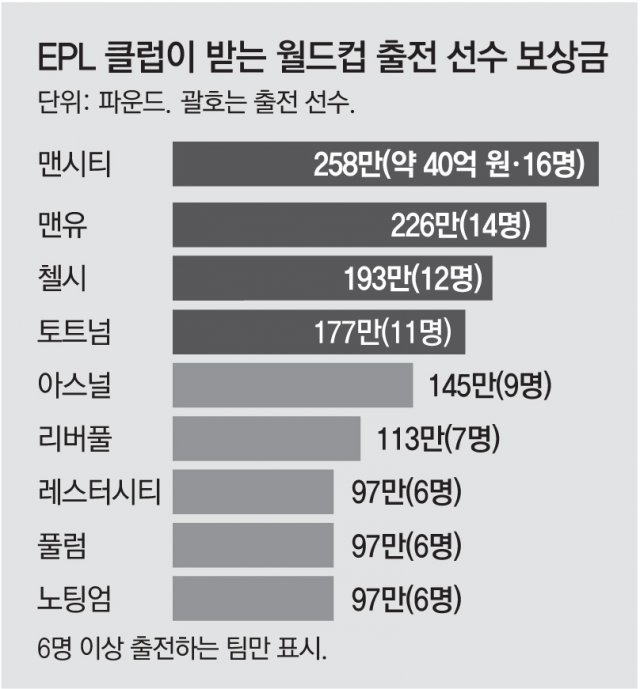 이 밖에 피파는 월드컵에 선수를 내보낸 전 세계 구단에도 보상금을 지급한다는 사실 알고 계셨나요? 예를 들어 손흥민이 소속된 토트넘은 총 11명의 선수가 월드컵에 출전했는데 이에 따르면 보상금 177만파운드, 우리돈 약 28억5005만원을 받게 되는 것입니다. 또한 12명을 보낸 첼시는 199만파운드(약 32억원), 선수 14명이 월드컵에 출전한 맨유는 226만파운드(약 36억4036만)를 받습니다.