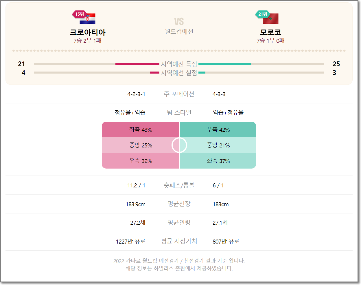양 팀 모두 주로 수비 축구를 선보이는 스타일이기 때문에 실점을 좀처럼 허용하지 않았습니다. 모로코는 아프리카 지역 예선에서 25점을 얻고 3실점, 크로아티아는 치열한 유럽 예선에서 21골을 넣고 4실점을 했습니다.