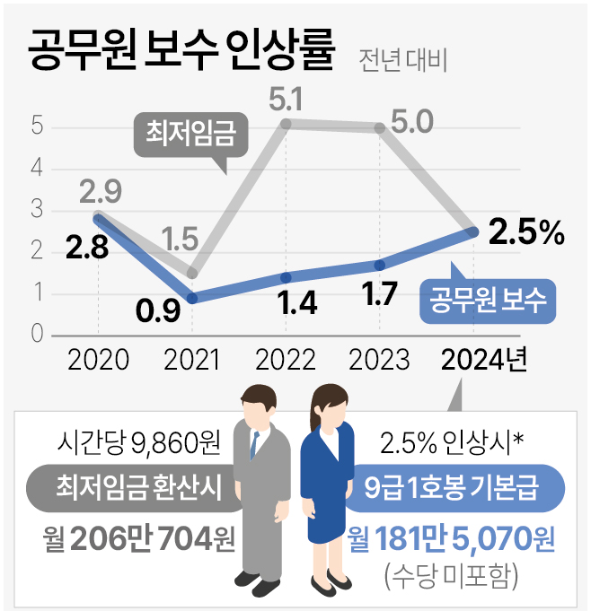 2024년 공무원 봉급 인상률은 2.5%입니다. 최근의 최저임금 인상률과 동일한 비율로 증가하는 것이며 2020년 이후 4년 만에 가장 큰 인상 폭입니다.