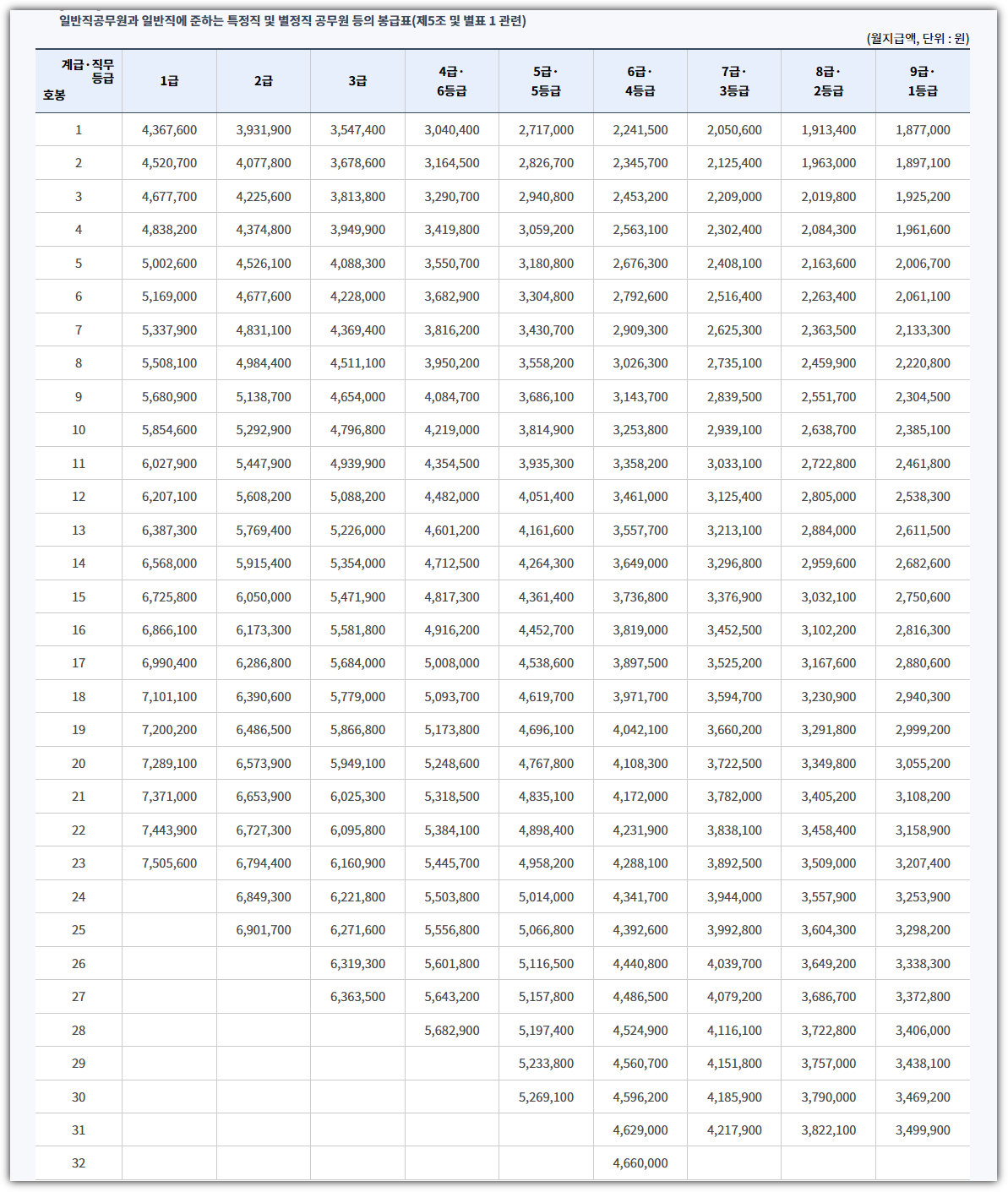 ■ 일반직 우정직군 공무원 봉급표