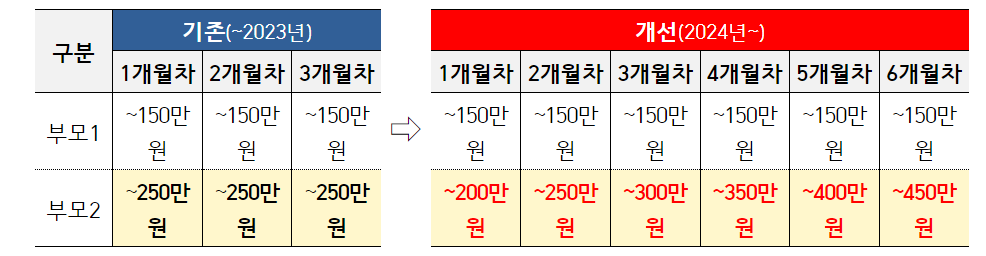 공무원 부모가 모두 육아휴직을 쓰는 경우 즉, 같은 자녀에 대해 부모가 모두 육아휴직을 할 때 두 번째로 육아휴직을 쓴 사람은 6개월간 최대 월 450만원까지 수당을 받을 수 있습니다. 기존 제도(3개월간 최대 월 250만원)와 비교하면 지급 기간과 규모가 모두 2배 정도 늘었는데요, 둘째 이후 자녀에 대한 육아휴직자는 휴직 중 공제 없이 육아휴직수당 전액을 받게 됩니다.
