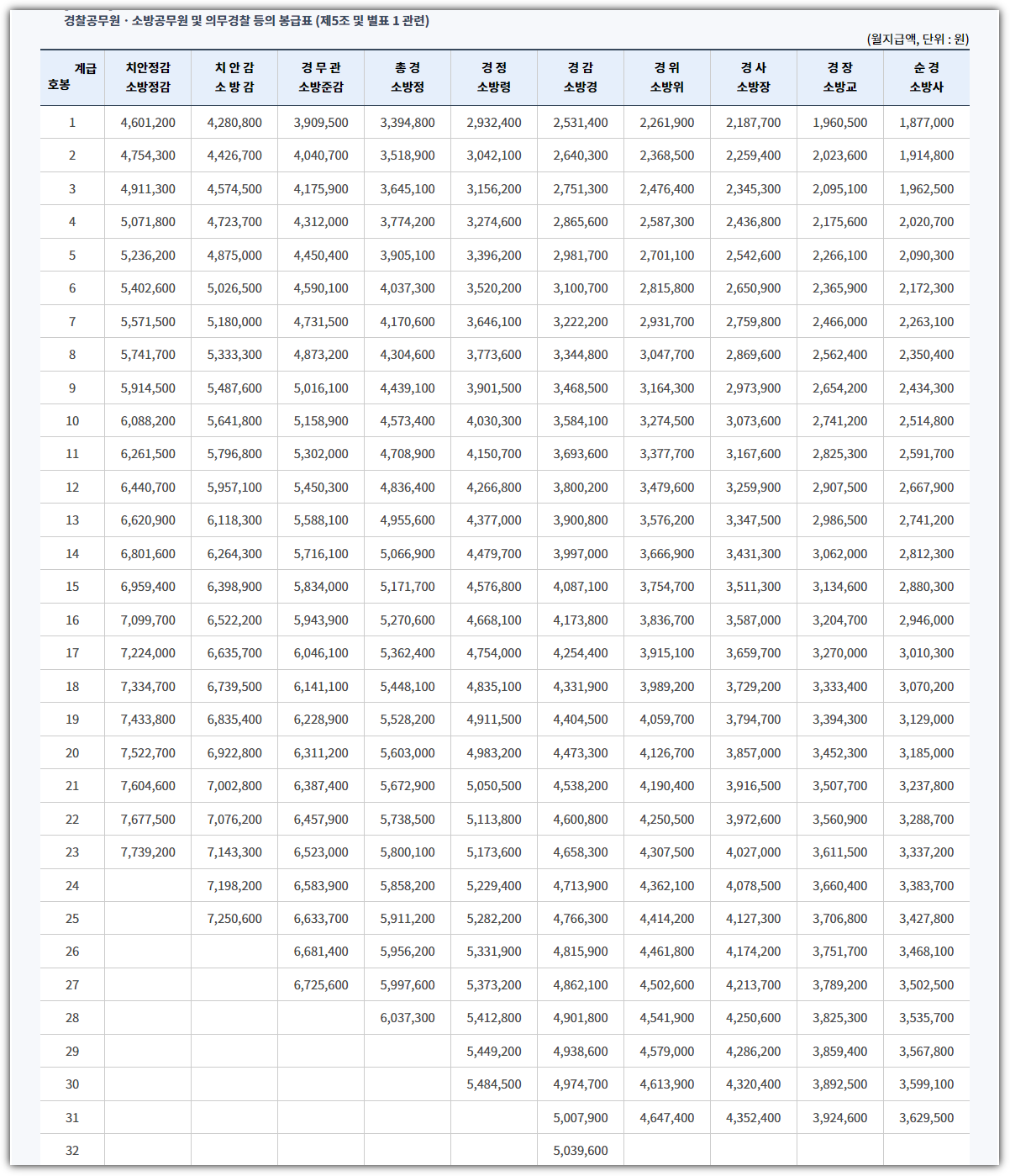 ■ 경찰·소방공무원 및 의무경찰 등 봉급표